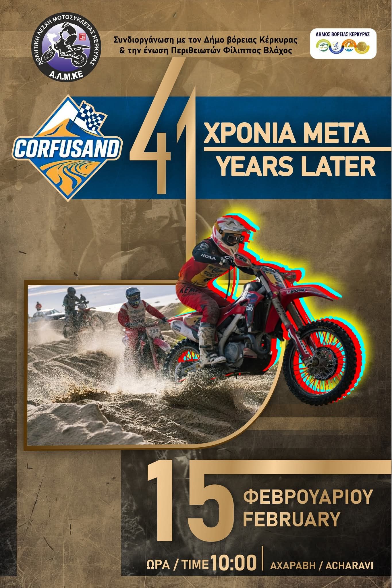 ΚΕΡΚΥΡΑ. Corfu Sand 2026 – Ένας συναρπαστικός αγώνας που επιστρέφει μετά από 41 χρόνια. Μία φιλική αναμέτρηση enduro και εκτός δρόμου, που διοργανώνει Α.Λ.Μ.ΚΕ σε συνεργασία με τον Δήμο Βόρειας Κέρκυρας και απευθύνεται σε όλους όσους αγαπούν το χώμα και την αδρεναλίνη – Πότε και πώς θα διεξαχθεί, όλα όσα θέλεις να ξέρεις, εδώ.