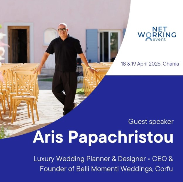 Το Σάββατο 18 Απριλίου,  ο Άρης Παπαχρήστου θα βρίσκεται στην Κρήτη για να μεταφέρει αυτή την πολύτιμη γνώση και να εμπνεύσει την τοπική wedding κοινότητα. Στο πλαίσιο του Networking Event (NEC), θα παρουσιάσει τον τρόπο με τον οποίο η συνέπεια, η εκλεπτυσμένη αισθητική και το διεθνές δίκτυο συνεργατών μπορούν να αναβαθμίσουν έναν προορισμό σε παγκόσμιας κλάσης wedding destination.