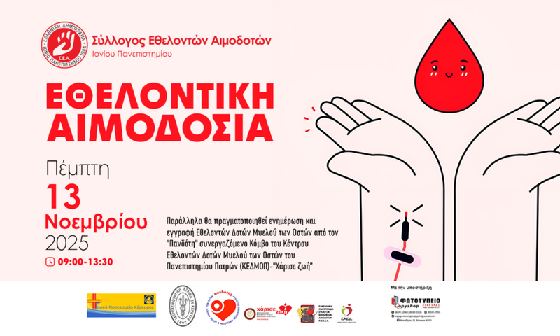 ΚΕΡΚΥΡΑ. Ο Σύλλογος Εθελοντών Αιμοδοτών του Ιονίου Πανεπιστημίου, σε συνεργασία με το Τμήμα Αιμοδοσίας του Γενικού Νοσοκομείου Κέρκυρας και την Ιατροχειρουργική Εταιρεία Κέρκυρας, ανακοινώνει τη διοργάνωση εθελοντικής αιμοδοσίας με την υποστήριξη του Συλλόγου Εθελοντών Αιμοδοτών & Δοτών Μυελού των Οστών Κέρκυρας «Πανδότης» (μέλος της Πανελλήνιας Ομοσπονδίας Συλλόγων Εθελοντών Αιμοδοτών), την Πέμπτη 13 Νοεμβρίου 2025, στο κτίριο Γαληνός (παλαιό ψυχιατρείο, Δονάτου Δημουλίτσα 74), από 09:00 έως 13:30.