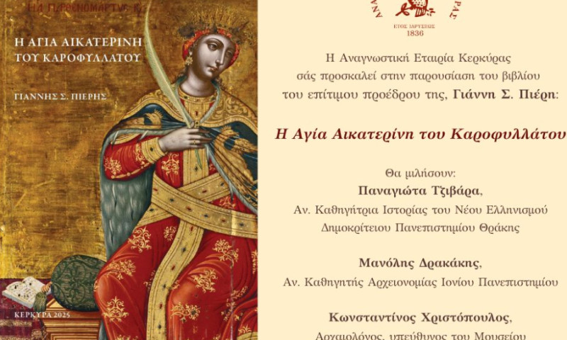 ΚΕΡΚΥΡΑ. (ΑΝΑΓΝΩΣΤΙΚΗ ΕΤΑΙΡΙΑ). H Αναγνωστική Εταιρία Κερκύρας, τη Δευτέρα 24 Νοεμβρίου 2025 και ώρα 20.00, παρουσιάζει το βιβλίο του επίτιμου προέδρου της, Γιάννη Σ. Πιέρη, με τίτλο «Η Αγία Αικατερίνη του Καρπόφυλλού».