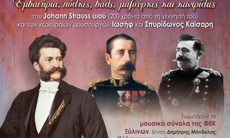 ΚΕΡΚΥΡΑ. Συναυλία της Μπάντας του Μουσικού Σώματος της Παλαιάς θα πραγματοποιηθεί την Κυριακή 30 Νοεμβρίου στις 8:00 μ.μ. στο Δημοτικό Θέατρο. Εμβατήρια, πόλκες, βάλς, μαζούρκες και καντρίλιες του Johann Strauss υιού (200 χρόνια από την γέννησή του) και των κερκυραίων μουσουργών Ιωσήφ και Σπυρίδωνος Καίσαρη. Συμμετέχουν τα μουσικά σύνολα της ΦΕΚ