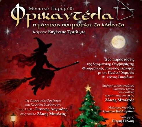 ΚΕΡΚΥΡΑ. Το έργο «Φρικαντέλα, η μάγισσα που μισούσε τα κάλαντα» βασίζεται στο ευφυέστατο παραμύθι του Ευγένιου Τριβιζά. Η Φρικαντέλα μισεί και θυμώνει με οτιδήποτε αρχίζει με τη λέξη «καλά». Μισεί, έτσι, και τα κάλαντα! Όταν ακούει παιδιά να τραγουδούν κάλαντα εξοργίζεται και για να σταματήσουν να τραγουδάνε τα μεταμορφώνει σε βατραχάκια, γατούλες και άλλα ζώα. Εκείνα όμως συνεχίζουν να τραγουδάνε και μετά από αρκετά κωμικά επεισόδια και αφού τραγουδήσουν κάλαντα από διάφορα μέρη της Ελλάδας, καταφέρνουν να πείσουν την Φρικαντέλα πως τα κάλαντα είναι πανέμορφα τραγούδια. Τώρα πια δεν θυμώνει με ότι αρχίζει με τη λέξη «καλα….» . Χορεύει και τραγουδάει μαζί με τους μικρούς της φίλους.