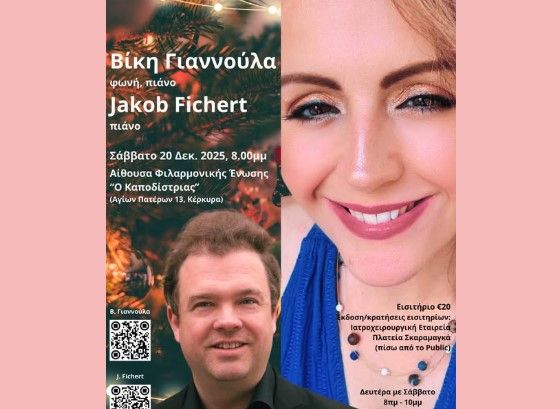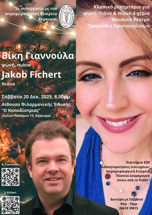 Η Κέρκυρα υποδέχεται δύο διεθνώς καταξιωμένους καλλιτέχνες, τη Βίκη Γιαννούλα (φωνή, πιάνο) και τον Jakob Fichert (πιάνο), σε μια μοναδική συναυλία που συνδυάζει την κλασική κομψότητα με τη λάμψη του μουσικού θεάτρου και την εορταστική ατμόσφαιρα.