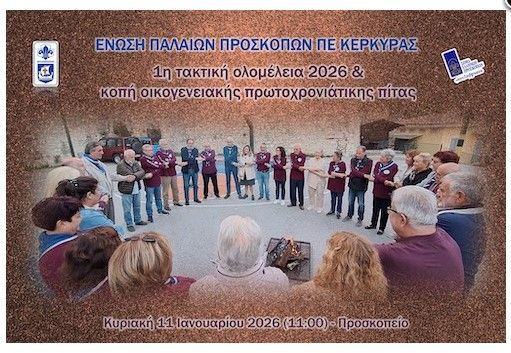 ΚΕΡΚΥΡΑ. Η Ομάδα Συντονισμού της Ένωσης Παλαιών Προσκόπων ΠΕ Κέρκυρας προσκαλεί τα μέλη της, τα ενήλικα στελέχη και μέλη της ΠΕ Κέρκυρας και τους φίλους της, την Κυριακή 11 Iανουαρίου και ώρα 11:00 στο Προσκοπείο, στην 1η τακτική Ολομέλειά της για το 2026, όπου όπως κάθε χρόνο, θα πραγματοποιηθεί, η κοπή της οικογενειακής πρωτοχρονιάτικης πίτας.
