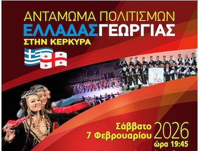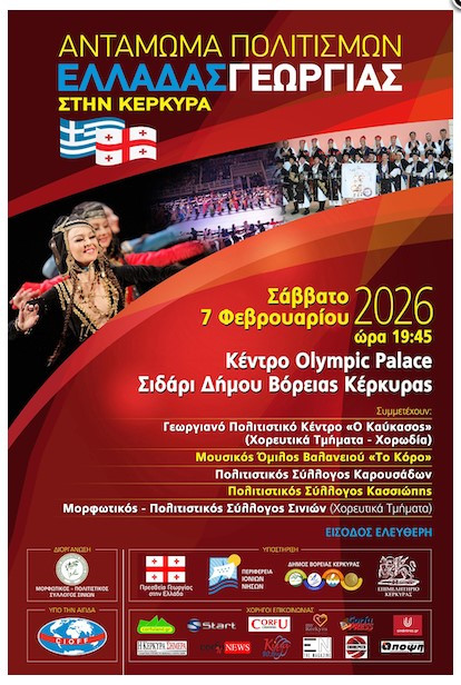 ΚΕΡΚΥΡΑ. Ο Μορφωτικός - Πολιτιστικός Σύλλογος Σινιών θα πραγματοποιήσει το διήμερο 06 και 07 Φεβρουαρίου 2026 εκδηλώσεις με θέμα Αντάμωμα Ελληνο-Γεωργιανού Πολιτισμού στην Κέρκυρα σε συνεργασία με το Γεωργιανό Πολιτιστικό κέντρο "CAUCASUS" καθώς και την Γεωργιανή Πρεσβεία στην Ελλάδα.