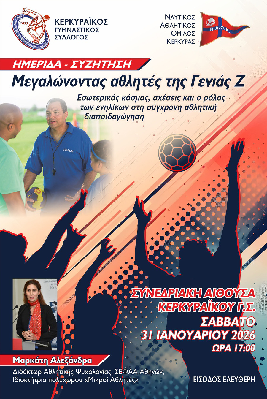 ΚΕΡΚΥΡΑ. Ο Κερκυραϊκός ΓΣ, σε συνεργασία με τον ΝΑΟΚ, διοργανώνει ημερίδα – ανοιχτή συζήτηση με θέμα "Μεγαλώνοντας αθλητές της Γενιάς Ζ: εσωτερικός κόσμος, σχέσεις και ο ρόλος των ενηλίκων στη σύγχρονη αθλητική διαπαιδαγώγηση" με εισηγήτρια την Κα Μαρκάτη Αλεξάνδρα, διδάκτωρα αθλητικής ψυχολογίας, ΣΕΦΑΑ Αθηνών, ιδιοκτήτρια πολυχώρου "Μικροί Αθλητές" με στόχο την ανάδειξη του ρόλου και της συνεργασίας των τριών βασικών πυλώνων του αθλητισμού, Γονιού-Αθλητή - Συλλόγου.