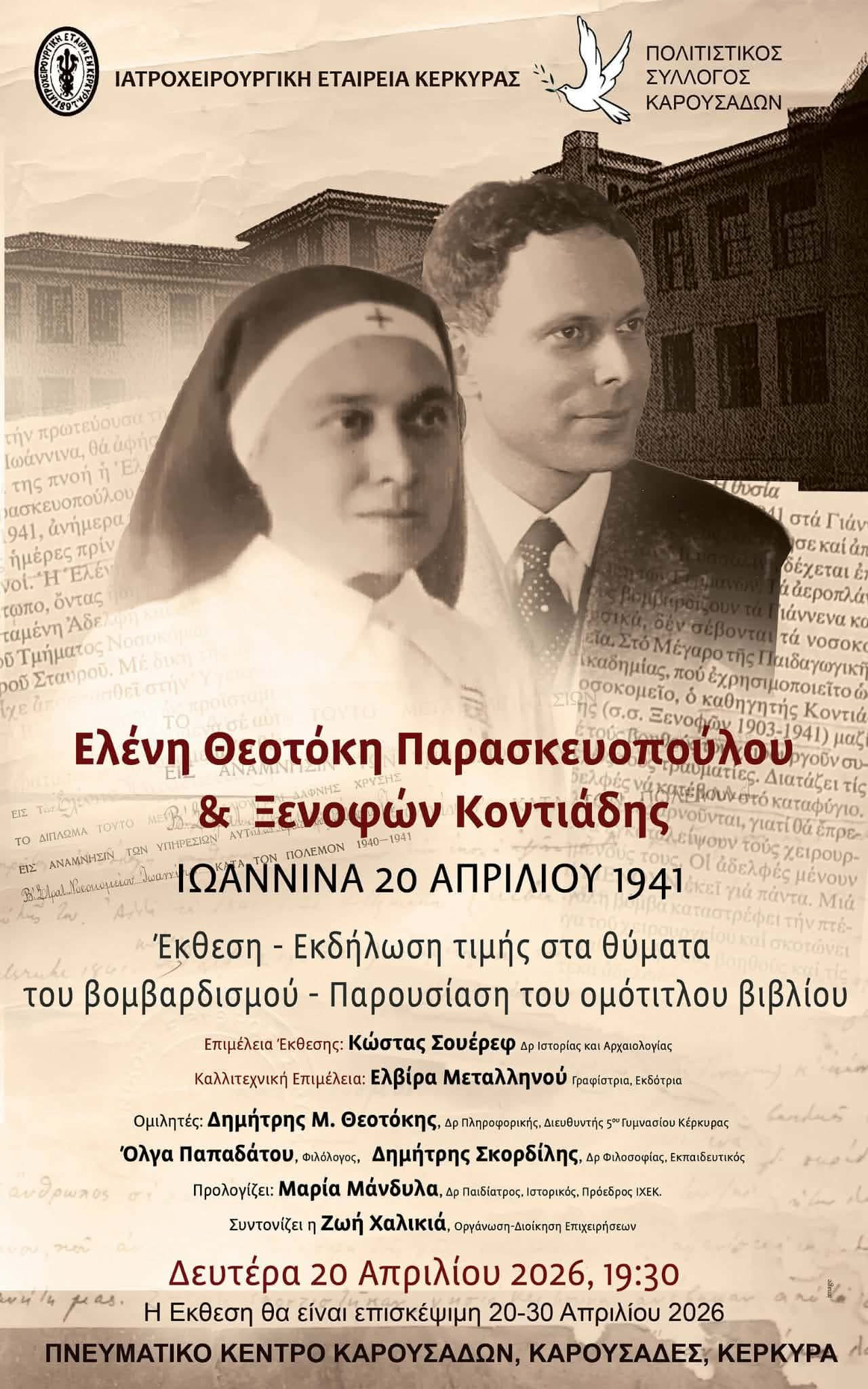 Η Ελένη Θεοτόκη Παρασκευοπούλου, εθελόντρια νοσοκόμα του Ελληνικού Ερυθρού Σταυρού και ο Ξενοφών Κοντιάδης, ιατρός χειρουργός, σκοτώθηκαν από γερμανική αεροτορπίλη στο 2ο Στρατιωτικό Νοσοκομείο Ιωαννίνων, στη Ζωσιμαία Ακαδημία, το Πάσχα 20 Απριλίου του 1941 κατά τη διάρκεια εγχείρησης τραυματία του ελληνοαλβανικού μετώπου. Η Ελένη Θεοτόκη, αδελφή του συγγραφέα Κωνσταντίνου Θεοτόκη, διακρίθηκε για την εθελοντική προσφορά της στους Βαλκανικούς Πολέμους, στον Πρώτο Παγκόσμιο Πόλεμο, στη Μικρασιατική Εκστρατεία, στην περίθαλψη των προσφύγων του 1922, στον Ελληνοϊταλικό Πόλεμο.