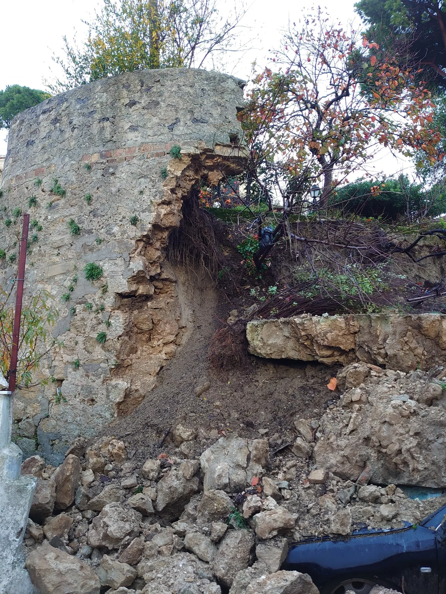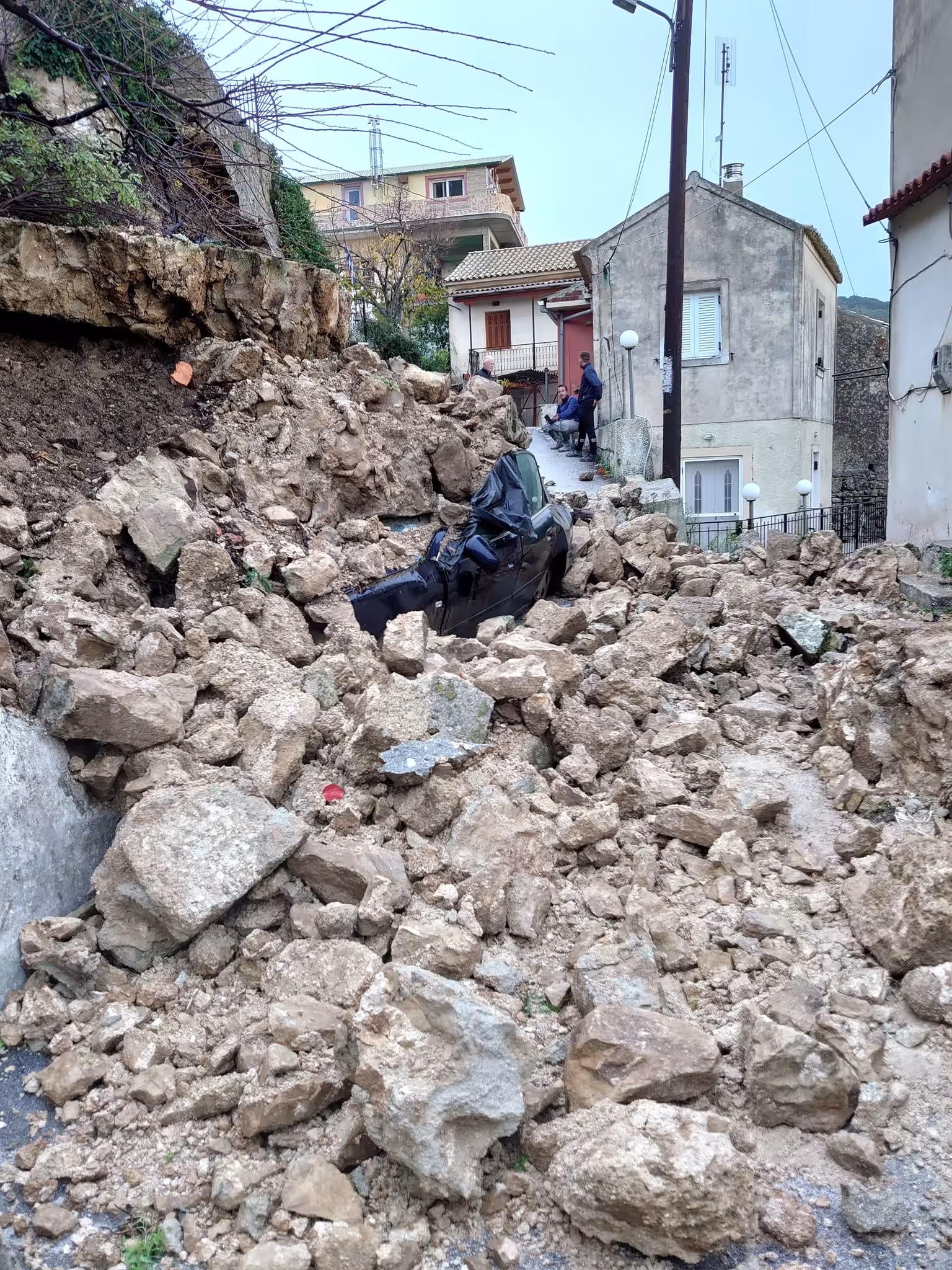 Συγκεκριμένα, λόγω της έντονης νεροποντής, κατέρρευσε τειχίο, το οποίο έπεσε και καταπλάκωσε ένα σταθμευμένο επιβατικό αυτοκίνητο (Ι.Χ.).
