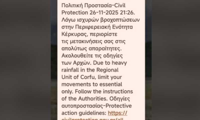ΚΕΡΚΥΡΑ. Μήνυμα 112 που προειδοποιεί τους πολίτες για έντονα καιρικά φαινόμενα κατά τόπους ισχυρά στην Περιφερειακή Ενότητα Κέρκυρας και συγκεκριμένα ισχυρές βροχοπτώσεις και καταιγίδες