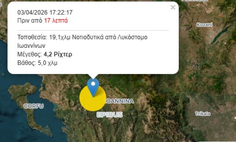 ΚΕΡΚΥΡΑ. Νέα σεισμική δόνηση καταγράφηκε πριν λίγο στη Θεσπρωτία, προκαλώντας ανησυχία στους κατοίκους της περιοχής. Ο σεισμός σημειώθηκε στις 17:22:17 ώρα Ελλάδας, είχε μέγεθος 4,2 Ρίχτερ 19,1χλμ Νοτιοδυτικά από Λυκόστομο Ιωαννίνων και σε εστιακό βάθος 5,0 χιλιομέτρων στην ίδια ευρύτερη σεισμική ζώνη που το τελευταίο διάστημα παρουσιάζει συνεχή δραστηριότητα. Η δόνηση έγινε αισθητή σε αρκετές περιοχές της Θεσπρωτίας και της Ηπείρου, αλλά και στην Κέρκυρα, ενώ η εξέλιξη του φαινομένου παρακολουθείται από τους αρμόδιους επιστημονικούς φορείς.