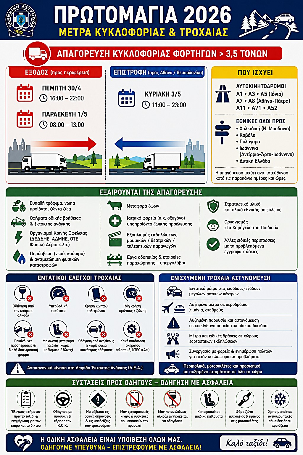 ΑΘΗΝΑ. Απαγορεύεται η κυκλοφορία φορτηγών άνω των 3,5 τόνων την Πέμπτη 30/4 από 16:00 έως 22:00 και την Παρασκευή 1/5 από 08:00 έως 13:00 στο ρεύμα εξόδου, καθώς και την Κυριακή 3/5 από 11:00 έως 23:00 στο ρεύμα επιστροφής, στους βασικούς αυτοκινητόδρομους και εθνικές οδούς της χώρας.