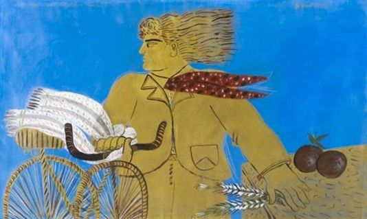 ΚΕΝΤΡΙΚΗ ΦΩΤΟ@Αλέκος Φασιανός, «Ο ποδηλάτης» (1985). Ο άνεμος στα μαλλιά, το στάχυ και το ποδήλατο — σύμβολα ελευθερίας, ώριμης νεότητας και πορείας προς το μέλλον. Η στιγμή που ο νέος παίρνει φόρα, κρατώντας στα χέρια του τους πρώτους καρπούς της ζωής.