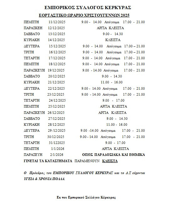 ΚΕΡΚΥΡΑ. Ο Εμπορικός Σύλλογος ανακοίνωσε το χριστουγεννιάτικο ωράριο των καταστημάτωντο οποίο έχει ως εξής: