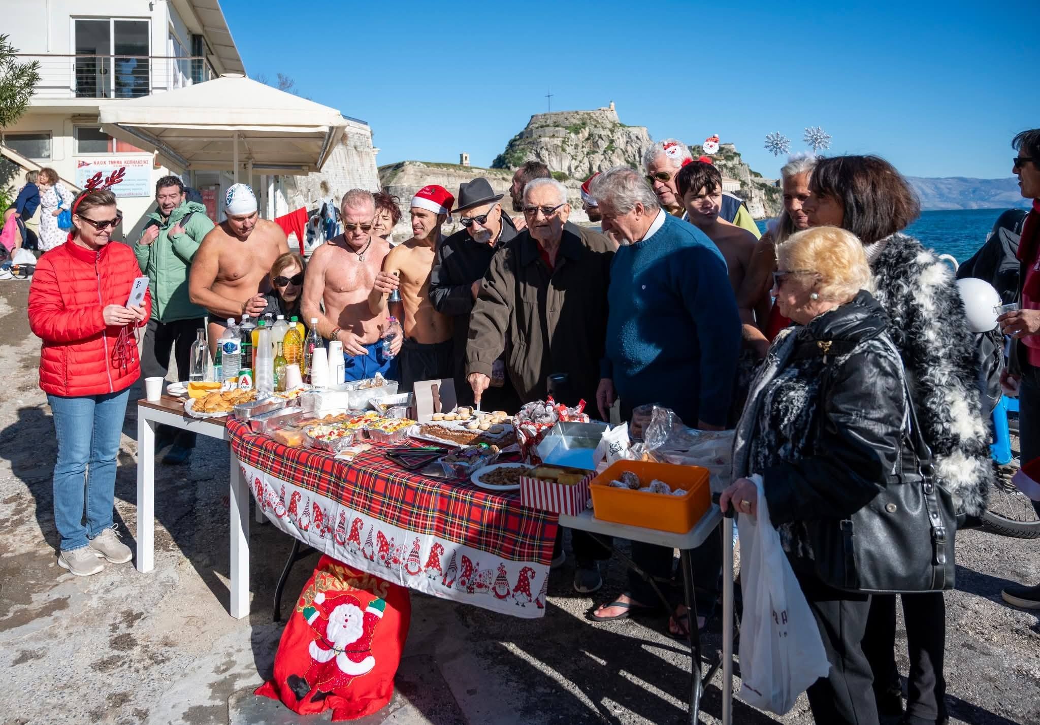 Η κορύφωση της γιορτής ήρθε με την ομαδική είσοδο στο νερό. Με τον Άγιο Βασίλη να δίνει το σύνθημα πέφτοντας τελευταίος, η θάλασσα γέμισε φωνές και τραγούδια, καθώς ψάλαμε όλοι μαζί τα πρωτοχρονιάτικα κάλαντα μέσα στο νερό!