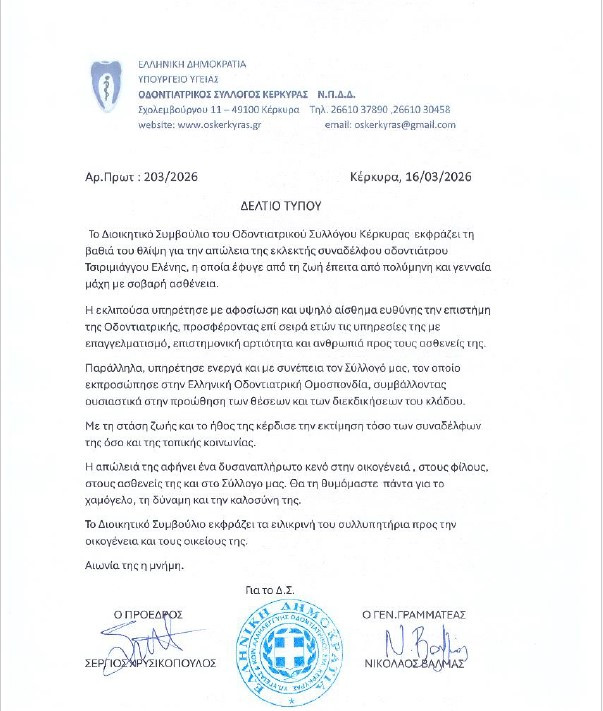 Ανακοίνωση Οδοντιατρικού Συλλόγου Κέρκυρας για την απώλεια της Ελένης Τσιριμιάγγου