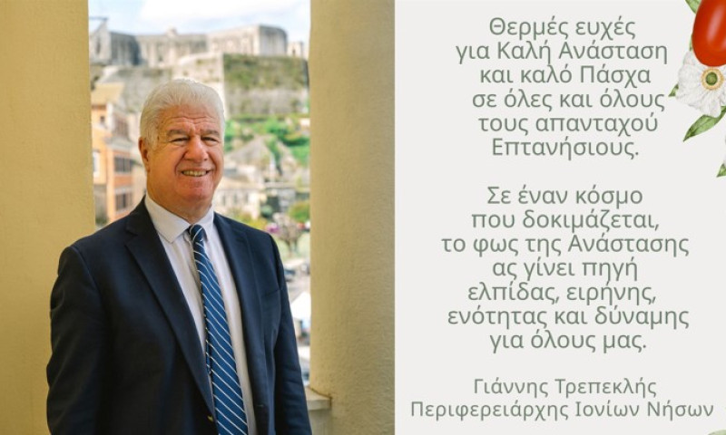 «Απευθύνω θερμές ευχές σε όλες και όλους τους κατοίκους των Ιονίων Νήσων και τους απανταχού Επτανήσιους για το Άγιο Πάσχα.