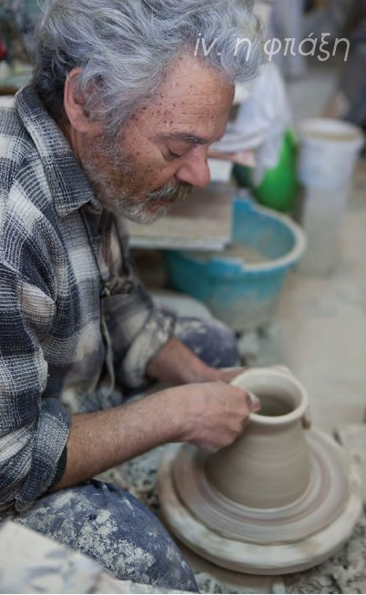 «Ναι. Ως 4 κιλά, οι στάμνες δουλεύονται μονοκόμματα, κτιστά. Σε μέρη, με επάλληλους δακτυλίους, δουλεύονται οι μεγάλες. Και τα πιθάρια, των 1,5-2 μ., με “μακαρόνια” (λωρίδες): το πρώτο πάνω στη λεκανίδα (βάση) και οι υπόλοιπες, η μία πάνω απ’ την άλλη. Πρόσεξε τώρα... Θα δώσουμε το σχήμα...»