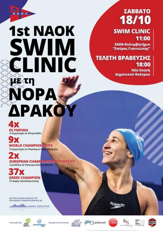 Σάββατο 18 Οκτωβρίου 2025 11:00πμ - 1o Swim Clinic με τη Νόρα Δράκου στο κολυμβητήριο “Σπύρος Γιαννιώτης”, ΕΑΚ Κέρκυρας