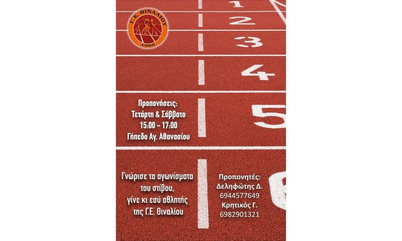Στο γήπεδο του Αγίου Αθανασίου έναντι Κέντρου Υγείας, λειτουργούν τμήματα Στίβου για όλες τις ηλικίες! Με έμπειρους στον χώρο του στίβου προπονητές και καταπληκτικές εγκαταστάσεις. Ευκαιρία για όλα τα παιδιά της περιοχής να αθληθούν και γιατί όχι να κάνουν καριέρα σε κάποιο άθλημα… Είναι πραγματικά μοναδική εμπειρία..».