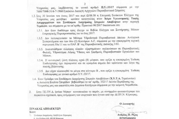 ΚΕΡΚΥΡΑ. Το πόρισμα που εξέδωσε η Διεύθυνση Περιβάλλοντος της ΠΙΝ ύστερα από αυτοψία στο χώρο του ΧΥΤΑ Τεμπλονίου, δίνει στη δημοσιότητα ο Πολιτιστικός και Εξωραϊστικός Σύλλογος Τεμπλονίου.