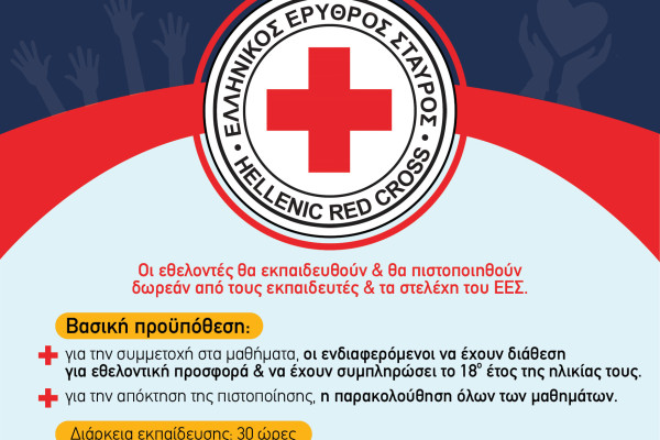 Οι εθελοντές θα εκπαιδευθούν και θα πιστοποιηθούν δωρεάν από τους εκπαιδευτές και τα στελέχη του Ελληνικού Ερυθρού Σταυρού.