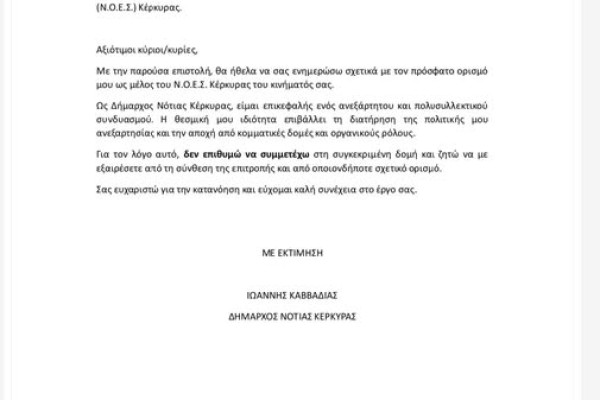 Ανοικτή επιστολή του προέδρου του Δημοτικού Συμβουλίου Νότιας Κέρκυρας: