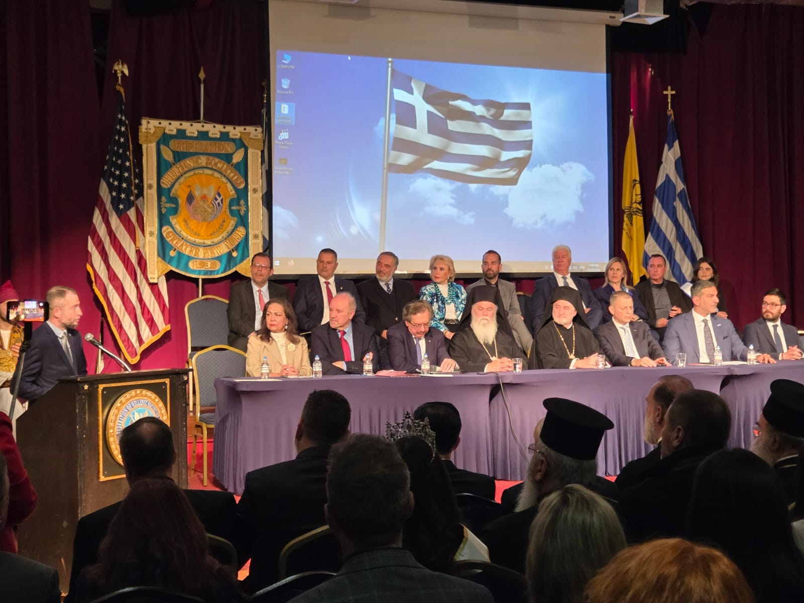 Την εκδήλωση τίμησαν με την παρουσία τους υψηλοί προσκεκλημένοι από τη μητέρα πατρίδα, υπογραμμίζοντας τους αδιάρρηκτους δεσμούς με την Ομογένεια. Μεταξύ αυτών, ο Πρόεδρος της Βουλής των Ελλήνων κ. Νικήτας Κακλαμάνης, συνοδευόμενος από τους Βουλευτές Θανάση Παπαθανάση και Γεώργιο Γαβρήλο, ο Διοικητής του Αγίου Όρους Αλκιβιάδης Στεφανής, οι Περιφερειάρχες Νεκτάριος Φαρμάκης (Δυτικής Ελλάδας) και Ιωάννης Τρεπεκλής (Ιονίων Νήσων), καθώς και ο Δήμαρχος της Ιεράς Πόλεως Μεσολογγίου, Σπύρος Διαμαντόπουλος. Η ημέρα έκλεισε με καλλιτεχνική λάμψη στη Metropolitan Opera, όπου ο διεθνής Έλληνας βαθύφωνος Αλέξανδρος Σταυρακάκης αποθεώθηκε ως Colline στη "La Bohème".
