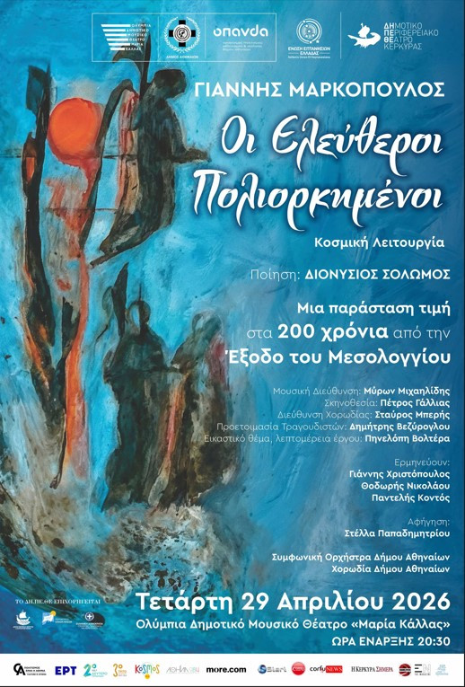 Το εμβληματικό έργο του Γιάννη Μαρκόπουλου «Οι Ελεύθεροι Πολιορκημένοι», σε ποίηση Διονυσίου Σολωμού, παρουσιάζεται την Τετάρτη 29 Απριλίου 2026, στις 20:30, στο Ολύμπια Δημοτικό Μουσικό Θέατρο «Μαρία Κάλλας», στο πλαίσιο του αφιερώματος για τη συμπλήρωση 200 χρόνων από την Έξοδο του Μεσολογγίου. Η παράσταση αποτελεί συμπαραγωγή του Οργανισμού Πολιτισμού, Αθλητισμού και Νεολαίας Δήμου Αθηναίων (Ο.Π.Α.Ν.Δ.Α.), της Ένωσης Επτανησίων Ελλάδας και του Δημοτικού Περιφερειακού Θεάτρου Κέρκυρας (ΔΗ.ΠΕ.ΘΕ. Κέρκυρας), με τη συμμετοχή της Συμφωνικής Ορχήστρας Δήμου Αθηναίων και της Χορωδίας Δήμου Αθηναίων.