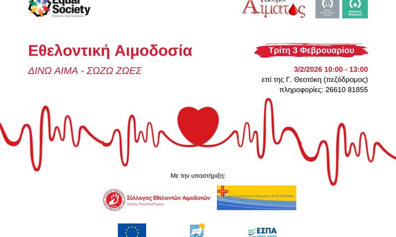 ΚΕΡΚΥΡΑ. (EQUAL SOCIETY). Η Equal Society σε συνεργασία με τον Σύλλογο Εθελοντών Αιμοδοτών του Ιονίου Πανεπιστημίου, με την υποστήριξη του Τμήματος Αιμοδοσίας του Γενικού Νοσοκομείου Κέρκυρας, διοργανώνουν δράση εθελοντικής αιμοδοσίας την Τρίτη 3 Φεβρουαρίου με στόχο την ενίσχυση της τράπεζας αίματος «Δεσμοί Αίματος» του Οργανισμού.