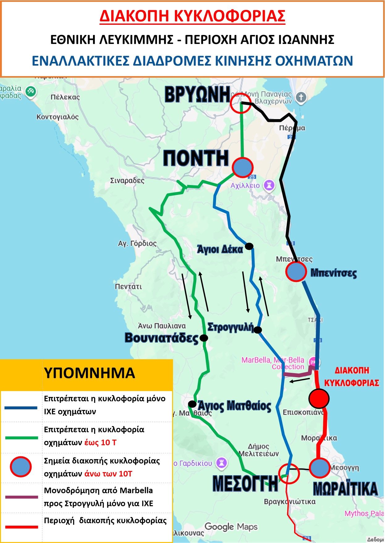 (ii) Κυκλοφορία μόνο Ι.Χ.Ε., με κατεύθυνση από Ε.Ο. Κέρκυρας προς Λευκίμμης θα διεξάγεται από Βρυώνη, Ποντή, Άγιοι Δέκα, Στρογγυλή και Μεσογγή και αντίστροφα για τα κινούμενα οχήματα από Λευκίμμη προς Κέρκυρα.