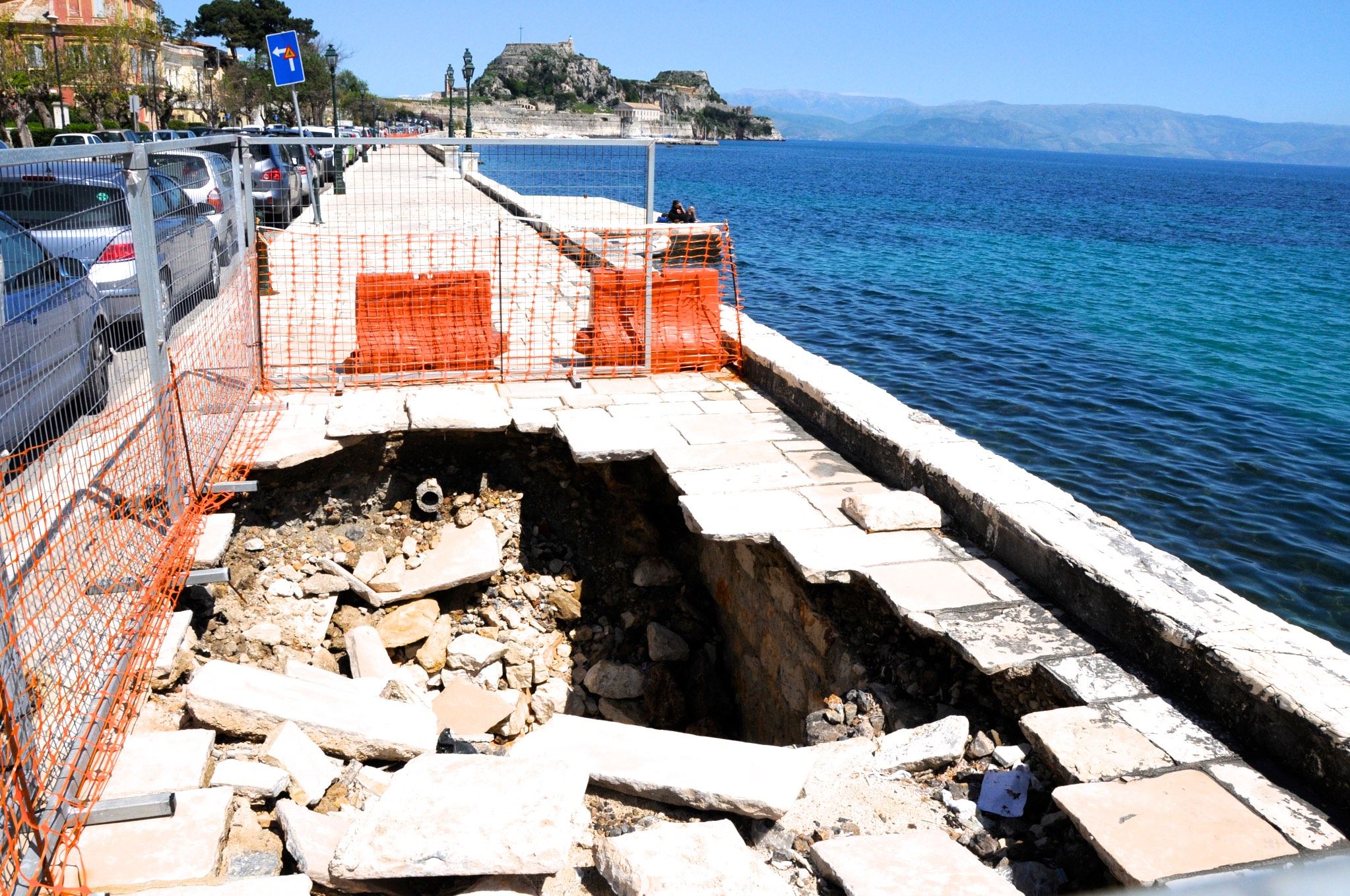 However, along the seafront, the flood-control works that followed did bring some improvement. The sea might spray and churn, but the water did not linger. The gradual removal of rocks from 1965 onward, however—despite the presence of the parapet—became the cause of acute and rapid erosion of the seafront paving, leaving dangerous craters in places and ultimately disrupting the Corfiot promenade, for which the area had been laid out from the period of British administration through to modern Greek times.