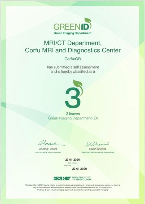 Πρόσφατα η Μαγνητική Τομογραφία Κέρκυρας απέσπασε από την Ευρωπαϊκή Εταιρεία Ακτινολογίας (ESR) το ''Green Imaging Department certificate'', και έγινε έτσι το πρώτο τμήμα ιατρικών απεικονίσεων στη χώρα που πιστοποιείται με αυτό το πολύ σημαντικό βραβείο. Η πιστοποίηση αυτή έρχεται ως επιστέγασμα ενός ολοκληρωμένου σχεδίου περιβαλλοντικής βιωσιμότητας το οποίο ήδη υλοποιεί το συγκεκριμένο διαγνωστικό κέντρο, και το οποίο έχει ως στόχο τη μείωση του αποτυπώματος άνθρακα και την προστασία του περιβάλλοντος από τις πρακτικές των ιατρικών απεικονίσεων. Με αυτό τον τρόπο η Μαγνητική Τομογραφία Κέρκυρας χαράσσει το δρόμο της περιβαλλοντικής συνείδησης στο χώρο των απεικονίσεων και γίνεται κέντρο αναφοράς στη χώρα μας.