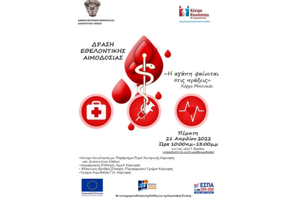 Την Πέμπτη 21 Απριλίου 2022, από τις 10.00 έως 13.00 επί της οδού Γ. Θεοτόκη (μπροστά από την κινητή μονάδα αιμοδοσίας του Γ.Ν.Κέρκυρας)